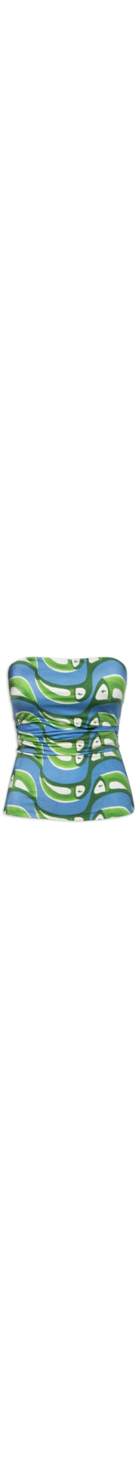 O top azul é confeccionado em malha cirrê de média elasticidade. A peça justa ao corpo, de modelo dupla face, possui decote tomara que caia reto com elástico embutido, pregas laterais na altura da cintura e estampa figurativa de tucanos em cores contrastantes. A outra face na cor verde, possui pregas na altura da cintura e estampa figurativa de tucanos em cores contrastantes.