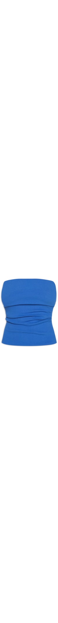 O top azul é confeccionado em malha leve com superfície canelada de média elasticidade. A peça justa ao corpo, de modelo tomara que caia, possui decote reto com elástico embutido, tecido duplo e pregas laterais.