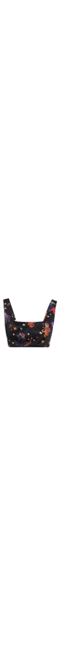 O top preto é confeccionado em tecido leve sem elasticidade. A peça justa ao corpo possui decote quadrado, alças médias, recortes frontais, lastex aplicado na parte posterior, tecido duplo, sem bojo, estampa figurativa em tons contrastantes e comprimento cropped*