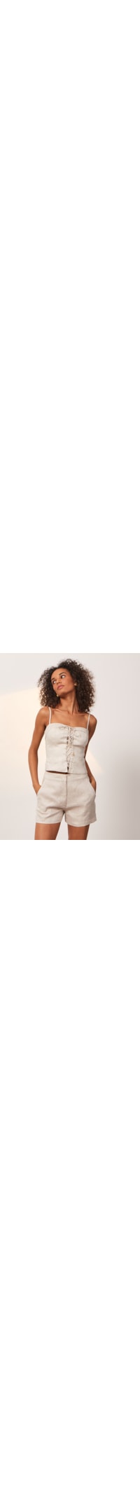 O top bege é confeccionado em linho sem elasticidade. A peça justa ao corpo possui decote reto, alças finas com regulagem, decote com pala, detalhe em amarração cruzado no busto, lastex posterior e fechamento por zíper posterior.