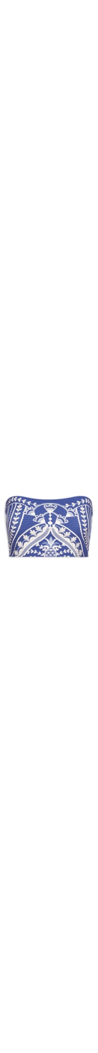 O top azul é confeccionado em tecido leve com alta elasticidade. A peça justa ao corpo de modelo tomara que caia possui decote reto, acabamento canelado, mix de estampa em cores contrastantes e comprimento cropped*.