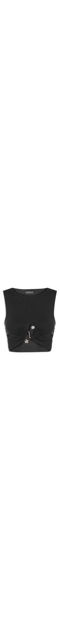 O top preto é confeccionado em malha leve com alta elasticidade. A peça justa ao corpo possui decote redondo, alças médias, detalhe franzido nas laterais com efeito drapeado e abertura frontal com aplicação de aviamento em metal e comprimento cropped*.