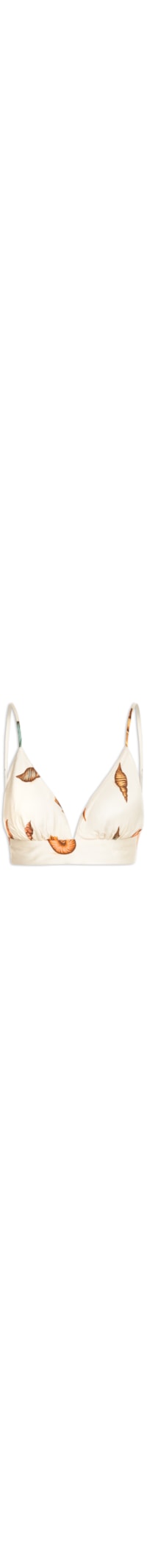 O top off white é confeccionado em tecido leve sem elasticidade. A peça justa ao corpo possui decote V, alças finas com regulagem na parte posterior, aplicação de lastex posterior, mix de estampas de conchas em cores contrastantes e comprimento cropped*.