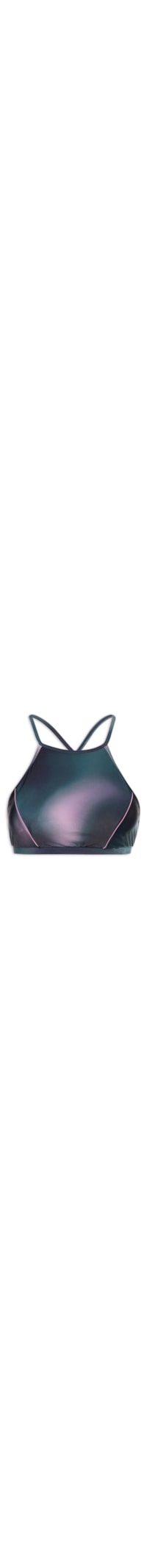 O top azul é confeccionado em malha de poliamida com alta elasticidade. A peça justa ao corpo possui decote trapézio, alças em tiras finas estendidas e cruzadas na parte posterior, recortes na área do busto, bojo removível, detalhes em vivo na cor rosa, fechamento posterior por amarração, estampa abstrata em cores contrastantes, e tag da marca aplicada na parte posterior em superfície emborrachada.
