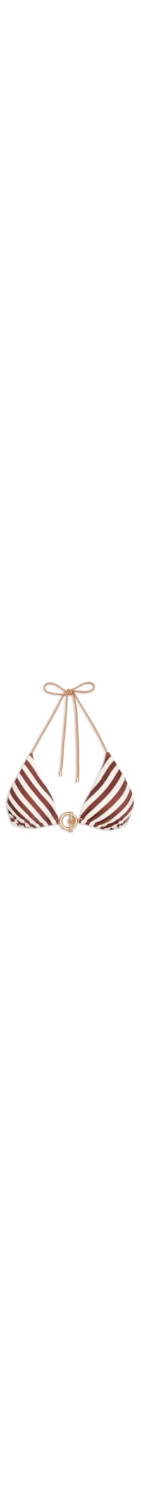 O top marrom é confeccionado em malha leve de média elasticidade. A peça de modelo cortininha, possui alças finas em cordão com ponteiras metálicas, detalhe frontal de argola metálica com encaixe T, padronagem listrada em marrom e off white, bojo removível, forro e fechamento posterior por amarração.
