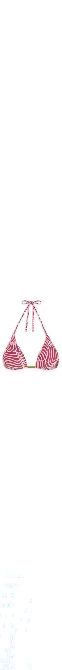 O top vermelho é confeccionado em malha leve de média elasticidade. A peça de modelo cortininha, possui decote em V, alças finas estendidas para amarração posterior, detalhe metálico aplicado na parte frontal, estampa de folhagem em cor contrastante, bojo removível, forro e fechamento posterior por amarração.
