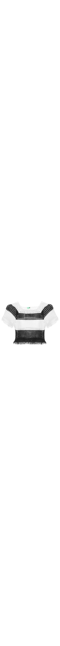 O top preto é confeccionado em tricot. A peça possui decote redondo, mangas curtas, padronagem de listras em cores contrastantes, franja aplicada nos punhos e barra, shape solto, comprimento cropped*, caimento reto e acabamento pespontado.