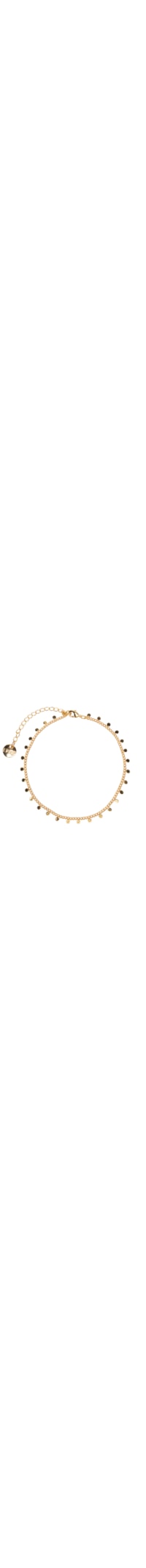 A tornozeleira dourada é produzida em metal com banho em ouro. A peça possui corrente fina, pingentes pequenos em formato circular e fechamento por fecho lagosta.