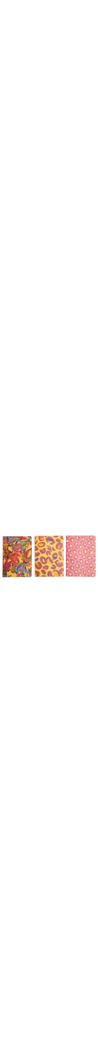O trio de cadernetas é produzido em papel. As peças possuem tamanho pequeno, formato retangular, 30 folhas sem pauta e capas com estampas figurativas em cores contrastantes.
