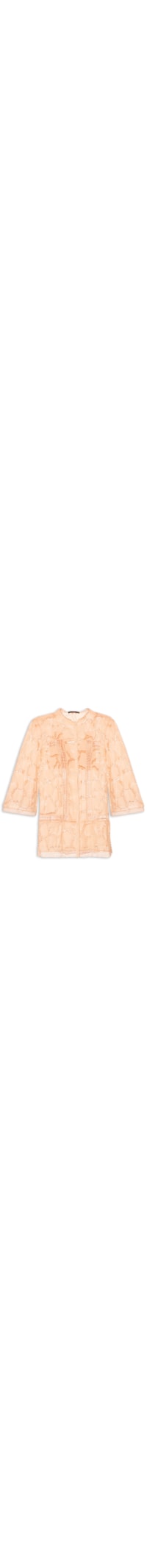 A túnica laranja é confeccionado por laise sem elasticidade. A peça solta ao corpo possui decote redondo, mangas longas, ombros levemente estendidos, fendas laterias, leve transparência, fechamento por botões frontais e comprimento alongado. O top é confeccionado por tecido leve sem elasticidade, possui decote V, alças fincas com regulagem, barra com elástico embutido e comprimento curto.
