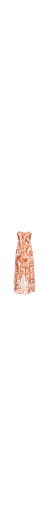A túnica rosa é confeccionada em tecido leve com fios de lurex sem elasticidade. A peça justa na altura do busto e solta no comprimento de modelo tomara que caia, possui decote coração, fenda frontal, forro no busto, aplicação de lastex na parte posterior, mix de estampas comprimento alongado e fechamento frontal por tiras alongadas para amarração.