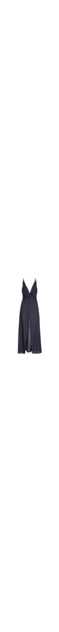 A túnica azul é confeccionada em tecido leve com toque de linho sem elasticidade. A peça solta ao corpo possui decote V frontal e posterior, alças finas reguláveis, detalhe frontal de nó, elástico embutido na parte posterior, transparência, sem bojo e comprimento alongado.
