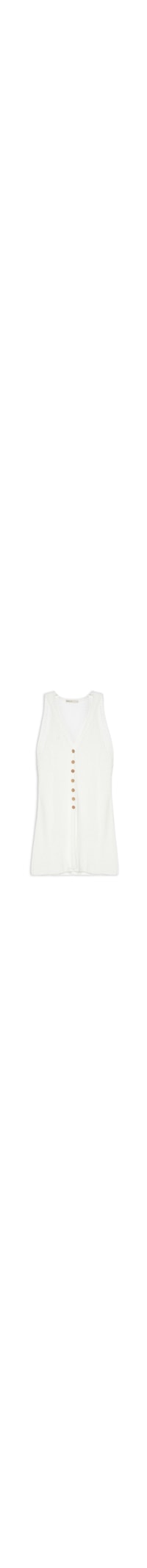 A túnica branco é confeccionada por tricot com média elasticidade. A peça solta ao corpo possui decote V, alças médias, cavas estendidas, fendas laterais, transparência, botões frontais e comprimento alongado.