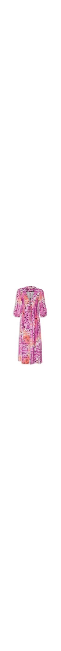 A túnica rosa é confeccionada em tecido leve com toque de linho sem elasticidade. A peça solta ao corpo possui decote V frontal, manga 3/4 com detalhe de pregas na altura dos ombros e elástico embutido na barra, mix de estampas em cores contrastantes, comprimento midi e fechamento frontal por amarração dupla.