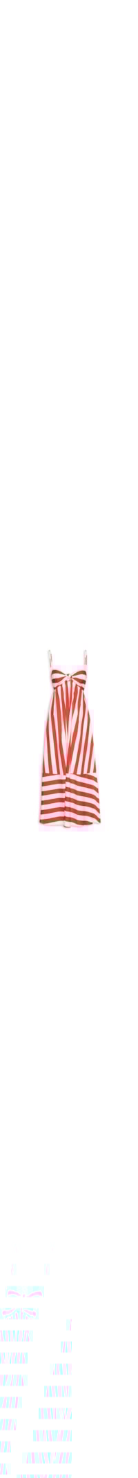 O vestido vermelho é confeccionado em tecido leve sem elasticidade. A peça justa ao busto e solta ao comprimento possui decote coração, alças finas reguláveis, recorte frontal vazado com detalhe de nó, lastex aplicado na parte posterior, padronagem listrada em cores contrastantes, forro superior e comprimento midi.
