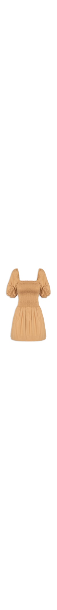 O vestido bege é confeccionado em tecido leve sem elasticidade. A peça justa no busto e solta no comprimento possui decote quadrado, mangas bufantes 3/4 com elástico embutido nas cavas e punhos, recorte superior com lastex embutido, recortes frontais e posteriores e comprimento curto.