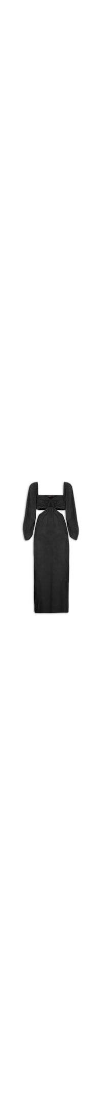 O vestido preto é confeccionado em tecido leve sem elasticidade. A peça justa ao busto e solta no comprimento possui decote princesa, mangas 7/8 bufantes com detalhe franzido na lateral, recortes frontais vazados estendidos para a parte posterior, lastex aplicado na parte posterior, bolsos frontais embutidos, fenda posterior, forro curto, sem bojo, comprimento midi e fechamento posterior em zíper invisível.