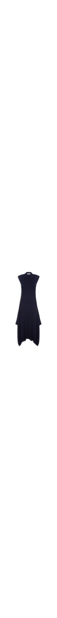 O vestido azul marinho é confeccionado por tricot canelado com média elasticidade. A peça justa ao corpo possui gola alta, alças grossas, ombreiras embutidas, fendas laterais e comprimento midi.