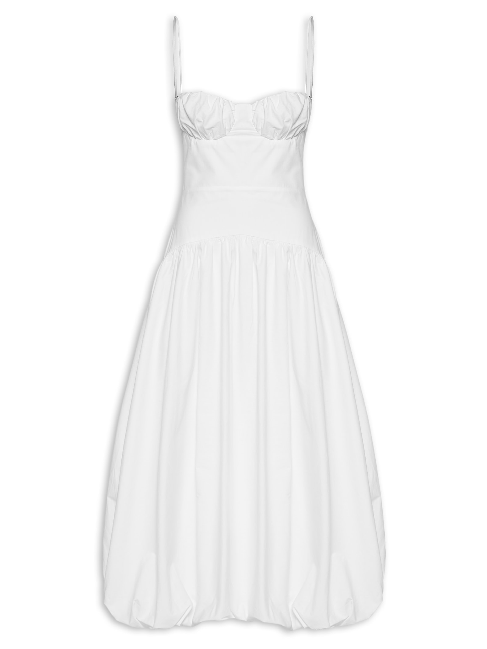 O vestido branco é confeccionado em tecido leve sem elasticidade. A peça justa ao busto e solta ao comprimento possui decote meia taça, alças finas com regulagem na parte posterior, cavas estendidas, lastex aplicado na parte posterior, recortes frontais e posteriores, barra com elástico embutido na barra e acabamento balonê, forro, comprimento midi e fechamento posterior por zíper.
