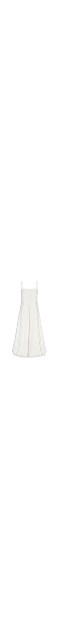 O vestido branco é confeccionado em malha de algodão sem elasticidade. A peça solta ao corpo possui decote reto, alças finas, cavas regulares, recortes nas partes frontal e posterior, passantes fixos com cordão para ajuste na parte posterior, barra com efeito balonê, comprimento midi e fechamento lateral por zíper invisível.