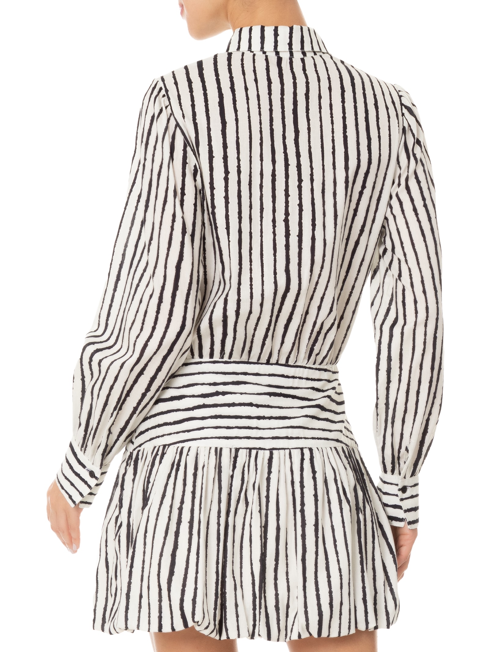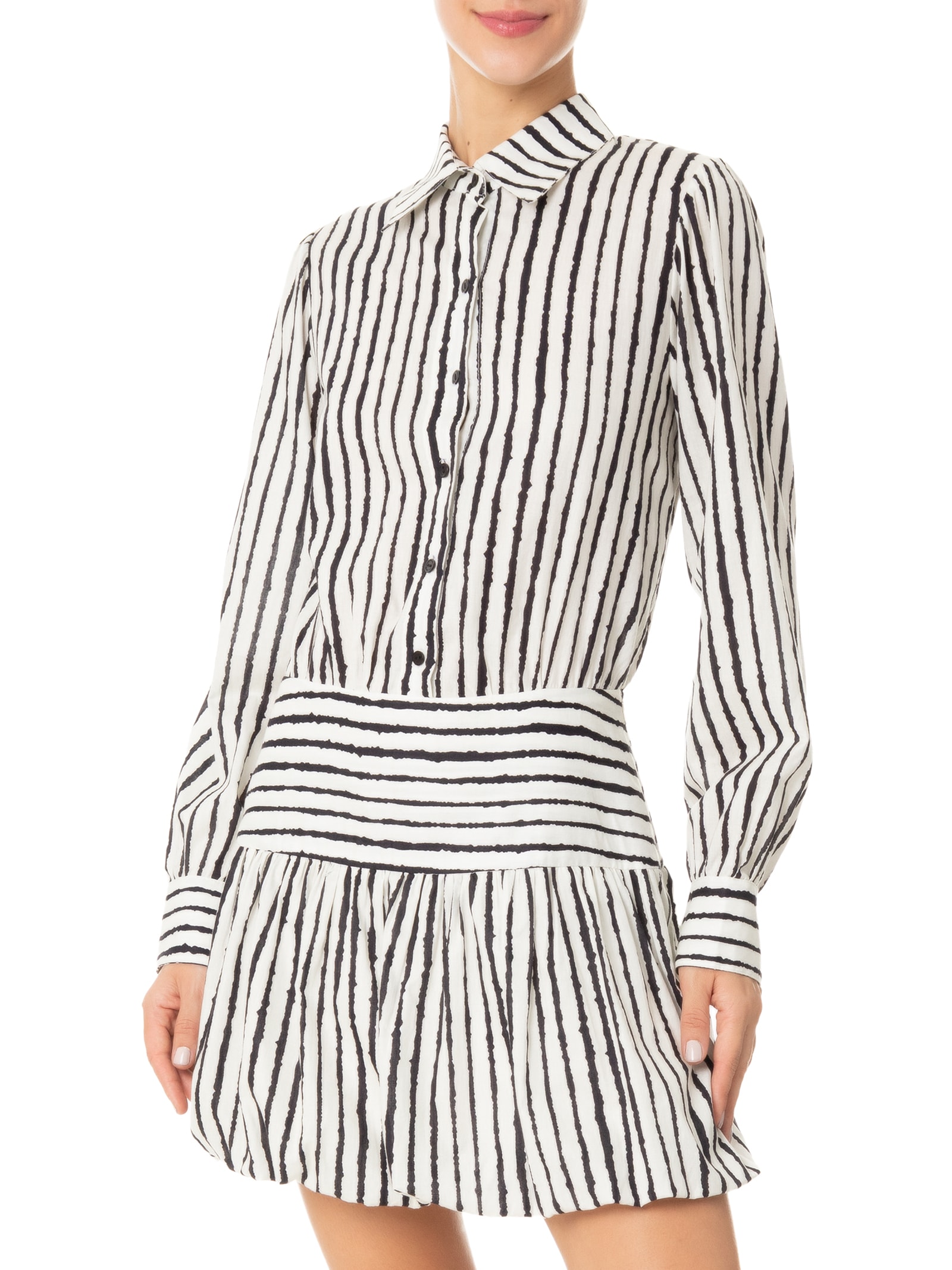 O vestido branco é confeccionado em tecido leve sem elasticidade. A peça solta ao corpo possui colarinho clássico, mangas longas com ajuste nos punhos, recorte frontal e posterior, forro, comprimento curto, padronagem de listras na cor preta e fechamento frontal por botões e lateral por zíper invisível.