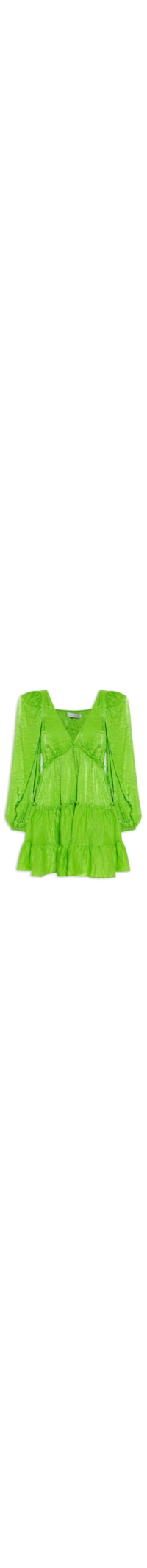 O vestido verde é confeccionado em tecido leve com superfície texturizada. A peça possui decote V, mangas bufantes com ombreiras e punhos com elástico embutido, recortes com detalhes de franzidos, comprimento curto, shape solto e caimento reto.