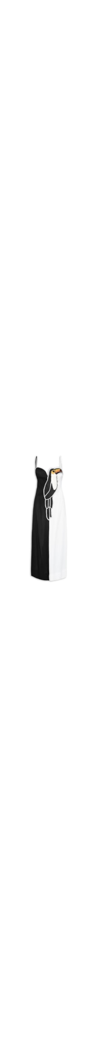 O vestido preto é confeccionado em tecido leve com toque de linho sem elasticidade. A peça justa no busto e solta no comprimento possui decote reto, alças finas reguláveis, recorte posterior em lastex, recorte posterior com fenda, recorte posterior e frontal na cor off white, bordado frontal abstrato de tucano, comprimento longo e fechamento posterior por zíper invisível.