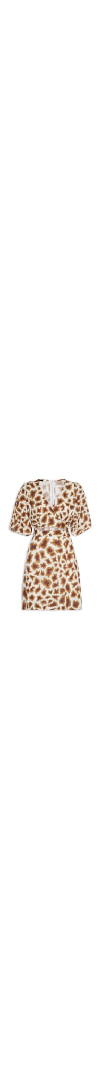 O vestido animal print é confeccionado em tecido leve. A peça possui decote V transpassado com faixas alongadas para amarração na altura da cintura, mangas 3/4 bufantes, pences frontais e posteriores na altura da cintura, recorte posterior, recorte frontal vazado na altura da cintura, forro, comprimento curto, shape solto, caimento reto, acabamento pespontado e fechamento posterior por zíper invisível.