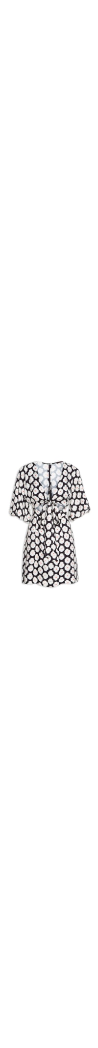 O vestido preto é confeccionado em tecido leve. A peça possui decote V profundo, mangas curtas bufantes, recorte posterior, recorte frontal vazado e pences posteriores e frontais na altura da cintura, faixas alongadas na altura do decote para amarração, forro, estampa floral em cores contrastantes, comprimento curto, shape solto e fechamento posterior por zíper invisível.