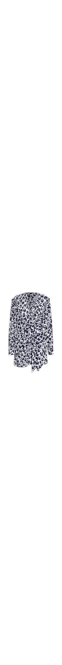 O vestido animal print é confeccionado em tecido leve. A peça decote V transpassado, mangas longas com abotoamento nos punhos, faixas estendidas para amarração, recortes posteriores, barra assimétrica, comprimento curto, shape solto, caimento reto, acabamento pespontado e fechamento frontal por amarração.