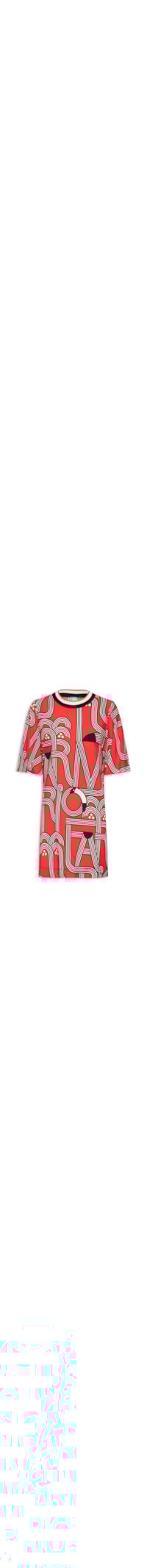O vestido vermelho é confeccionado em tecido leve sem elasticidade. A peça solta ao corpo possui decote redondo com acabamento canelado com frisos em cores contrastantes, mangas curtas, estampa abstrata em cores contrastantes e comprimento curto.