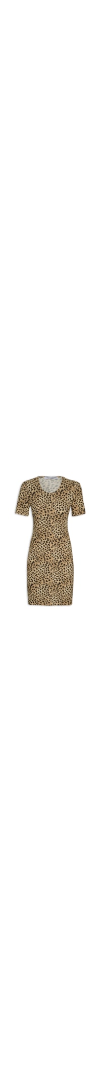 O vestido animal print é confeccionado em malha canelada com alta elasticidade. A peça justa ao corpo possui decote redondo, mangas curtas, tag da marca aplicada em metal na parte posterior na altura do decote, comprimento curto e não possui fechamento.