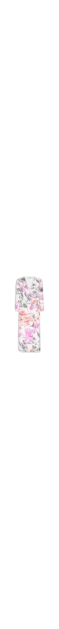 O vestido branco é confeccionado em malha leve de média elasticidade. A peça solta ao corpo, possui decote em V com transpasse frontal, mangas 7/8 justas, argola embutida na lateral da cintura com faixa larga aplicada, tag metálica da marca aplicada na parte posterior do decote, mix de estampas em cores contrastantes, comprimento midi, forro e fechamento frontal por amarração.