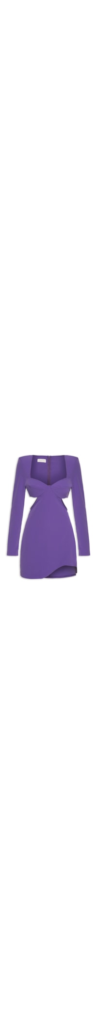 O vestido roxo é confeccionado em tecido leve. A peça possui decote coração, mangas longas, detalhe acolchoado na altura dos ombros, recorte posterior, tag da marca aplicada em metal na altura do decote posterior, recortes na altura do busto, recortes laterais vazados na altura da cintura, bojo, comprimento curto, shape justo, caimento reto, acabamento pespontado e fechamento posterior por zíper invisível.