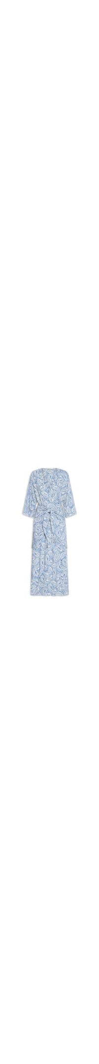 O vestido azul é confeccionado em tecido leve sem elasticidade. A peça solta ao corpo possui decote V profundo, tiras alongadas nas laterais com tassel nas pontas para amarração frontal, botão frontal e cordão embutido para amarração, mangas 3/4 amplas, mix de estampas em cor contrastante e comprimento longo.