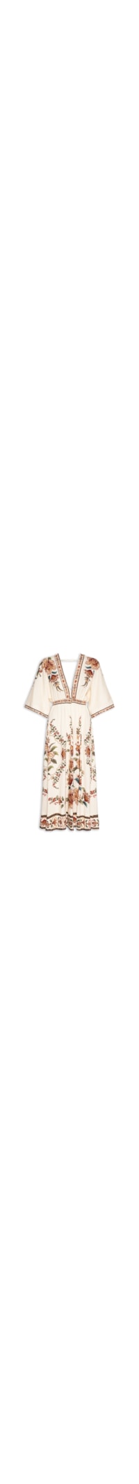 O vestido off white é confeccionado em tecido leve sem elasticidade. A peça solta ao corpo possui decote V profundo, mangas 3/4 amplas, tira alongada aplicada na parte posterior para sustentação, elástico embutido na cintura, comprimento midi e mix de estampas em cores contrastantes.