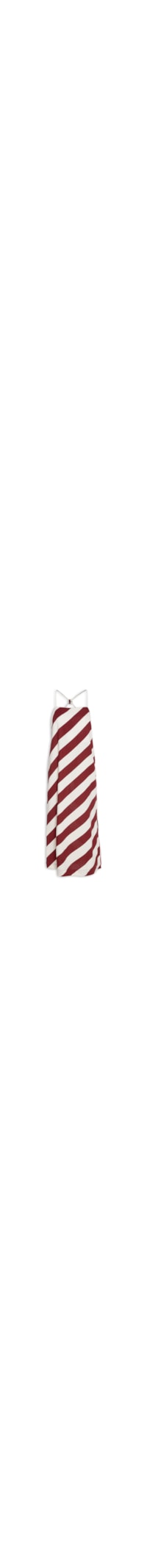 O vestido vermelho é confeccionado em linho misto sem elasticidade. A peça solta ao corpo, possui decote reto, alças finas estendidas para amarração posterior, miçanga aplicada nas alças, pence frontal, fendas laterais, elástico aplicado na parte posterior do decote, estampa listrada diagonal em cores contrastantes, comprimento midi e fechamento posterior por zíper invisível.