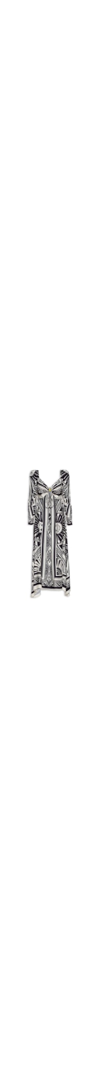 O vestido branco é confeccionado em tecido leve sem elasticidade. A peça solta ao corpo, possui decote em V, mangas longas bufantes com elástico embutido nos ombros, punho afunilado com abotoamento, recorte frontal vazado com cordão embutido com ponteira de miçanga para amarração, lastex aplicado na parte posterior, barra assimétrica, mix de estampas em cores contrastantes e comprimento longo.