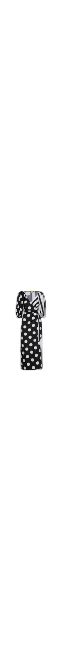 O vestido preto é confeccionado em tecido leve sem elasticidade. A peça solta ao corpo, possui decote em V, pregas nos ombros, mangas curtas bufantes com elástico embutido nos punhos, transpasse frontal com amarração lateral, recorte posterior, mix de estampas de poá e listras em cores contrastantes, forro texturizado e comprimento midi.