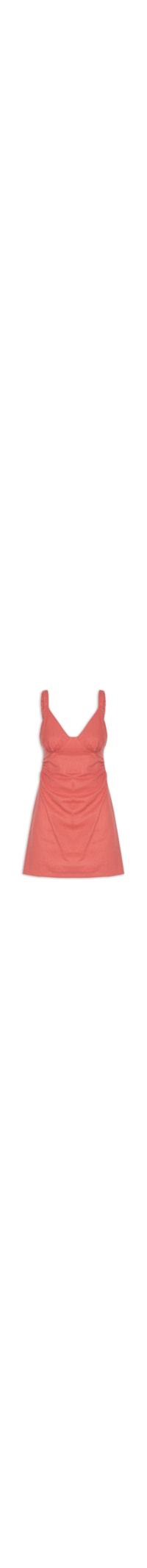 O vestido vermelho é confeccionado em linho misto sem elasticidade. A peça justa no busto e solta ao corpo possui decote V, alças finas com elástico, detalhes drapeados no busto, comprimento curto e fechamento posterior por zíper invisível.