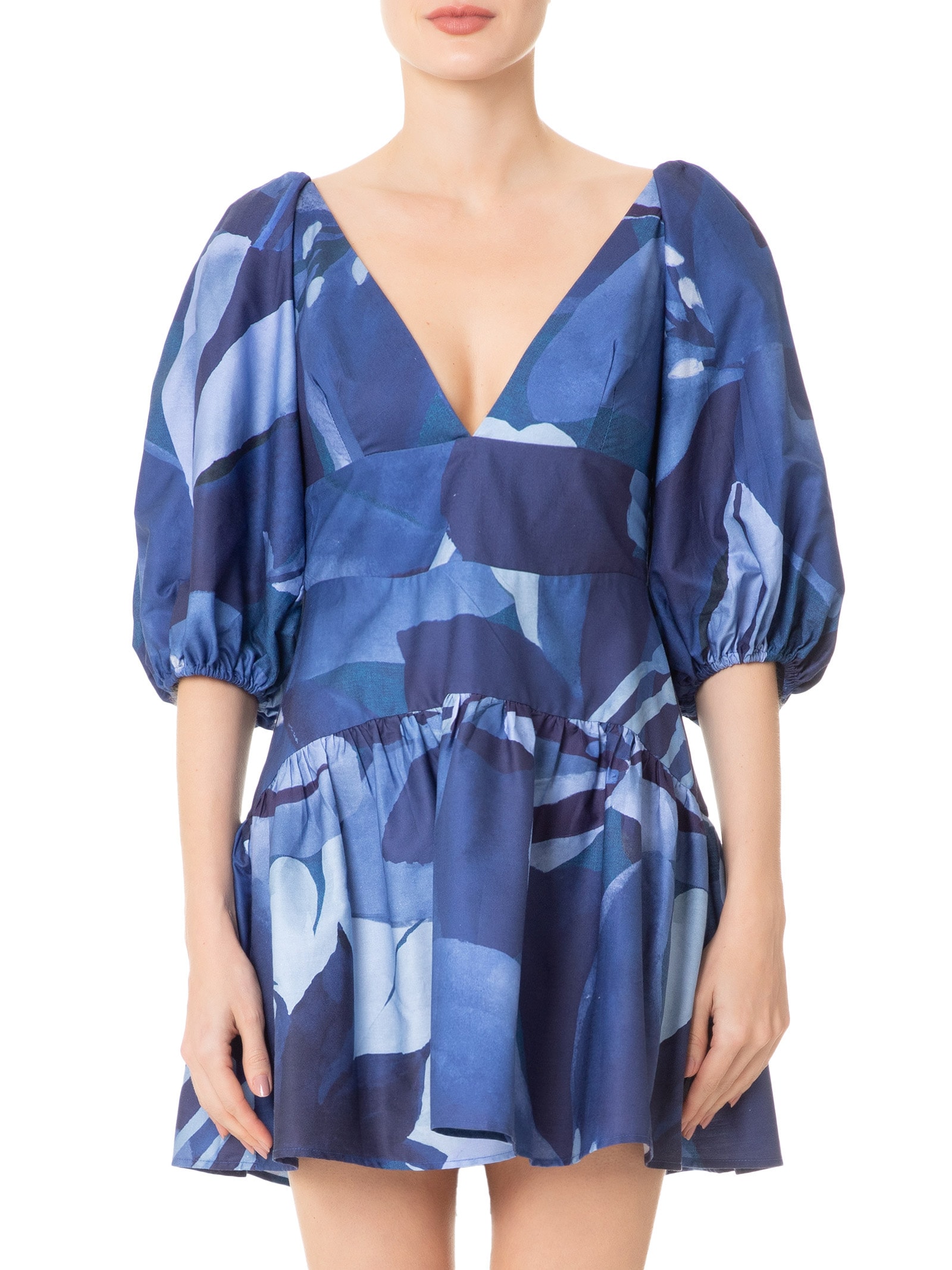 O vestido azul é confeccionado em tecido leve sem elasticidade. A peça justa no busto e solta no corpo possui decote V profundo, mangas 3/4 bufantes com elástico embutido nos ombros e punhos, cintura com recortes frontais e lastex embutido na parte posterior, recorte com detalhes de franzidos, estampa abstrata em tons contrastantes, comprimento curto e fechamento posterior por zíper.