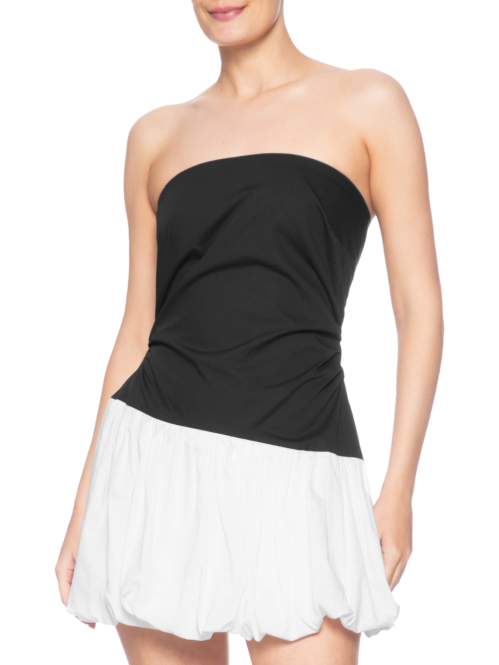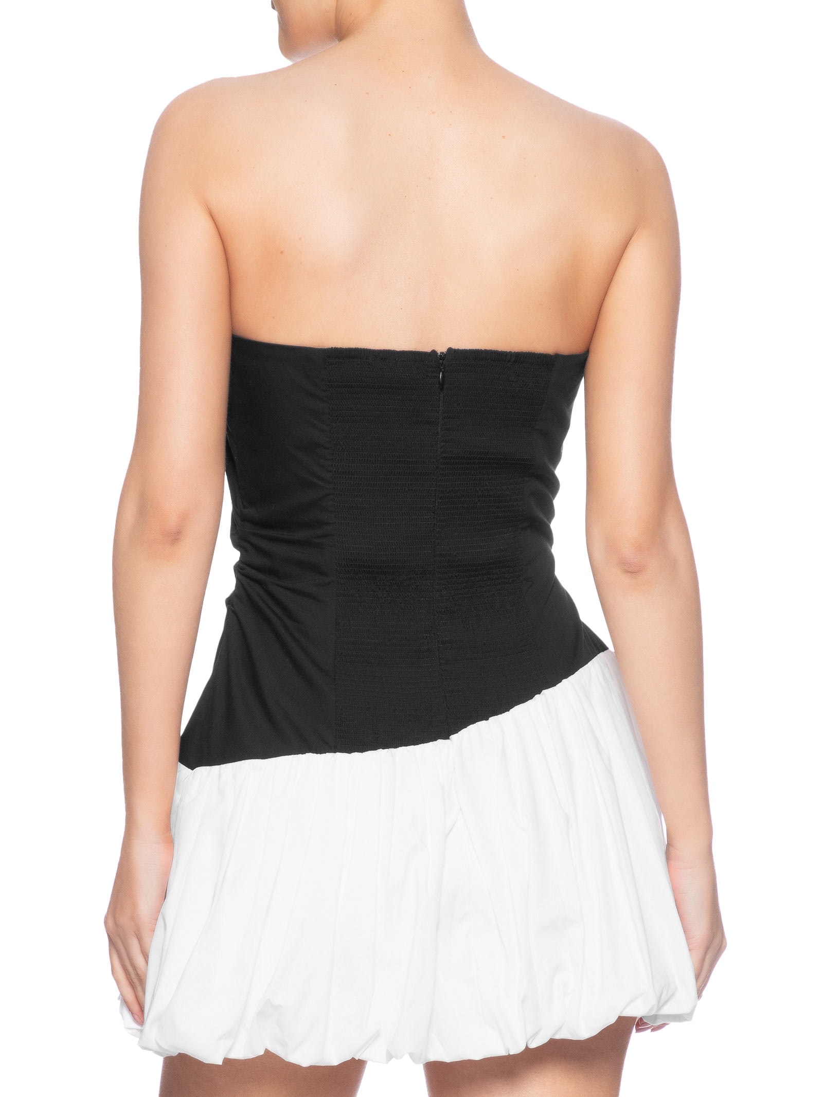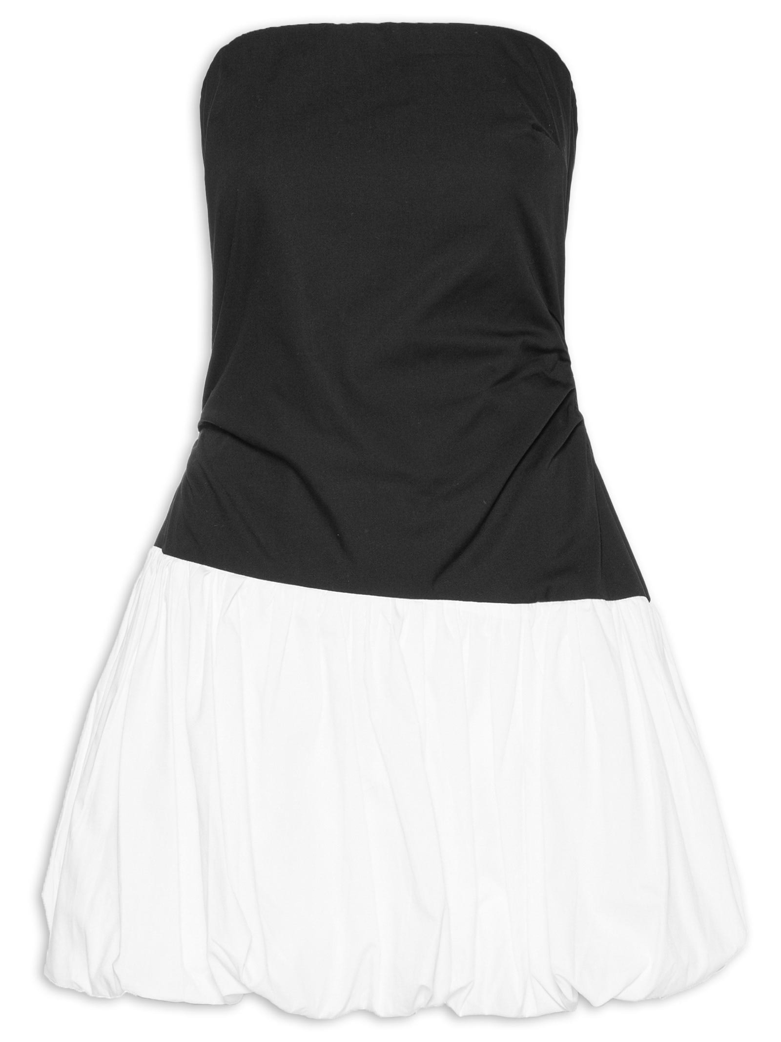 O vestido preto é confeccionado em tecido leve sem elasticidade. A peça de modelo tomara que caia, justa no busto e solta no comprimento possui decote reto, recorte na altura da cintura, franzidos laterais, aplicação de lastex posterior, saia balonê, forro, comprimento curto e fechamento posterior por zíper invisível.