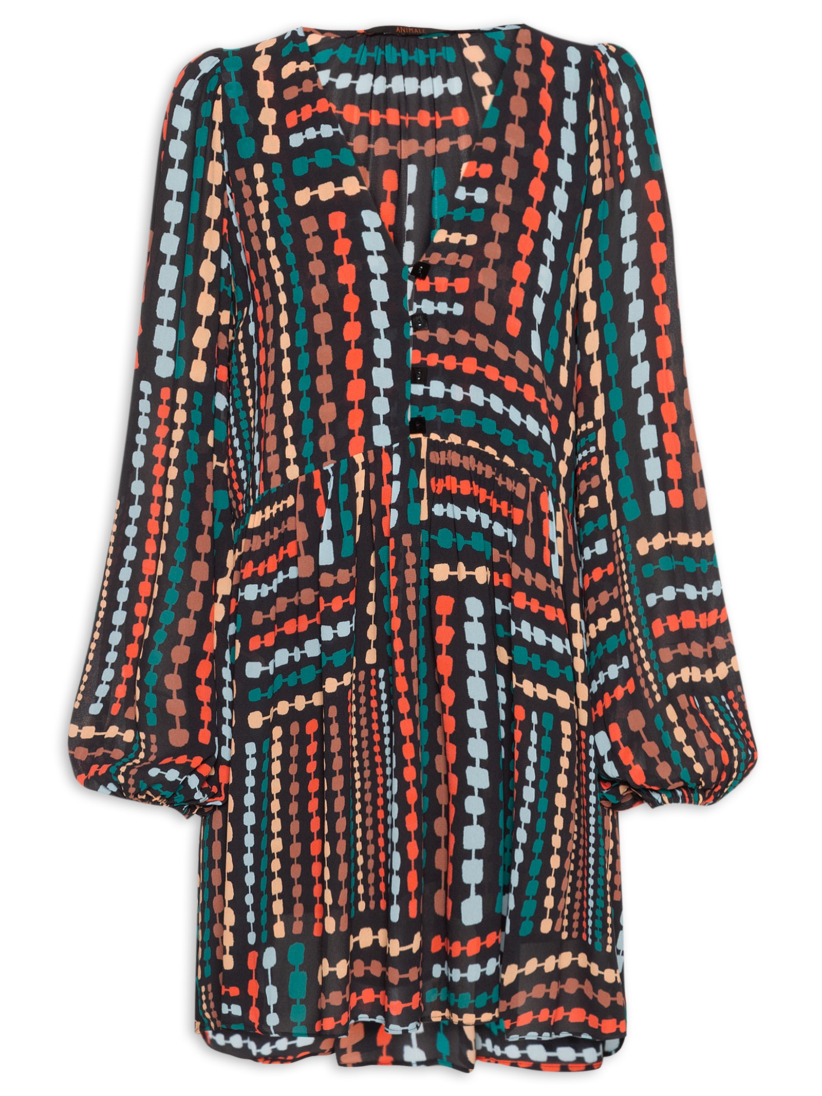 O vestido preto é confeccionado em tecido leve sem elasticidade. A peça solta ao corpo possui decote V, mangas longas bufantes, recorte na altura da cintura com franzidos, estampa abstrata em cores contrastantes, forro, comprimento curto e fechamento frontal por botões.