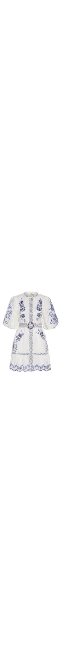 O vestido branco é confeccionado em tecido leve com toque de linho sem elasticidade. A peça solta ao corpo possui gola padre, mangas curtas bufantes com elástico embutido na barra, recorte na altura da cintura e no comprimento com efeito franzido, passantes aplicados nas laterais, mix de estampas em cor contrastante, aplicação de bordados na manga e em recorte no comprimento em cor contrastante, comprimento curto e fechamento frontal em botões. Acompanha cinto em tira média do mesmo tecido e estampa com fivela arredondada e aplicação de miçangas em cores contrastantes para uso opcional.