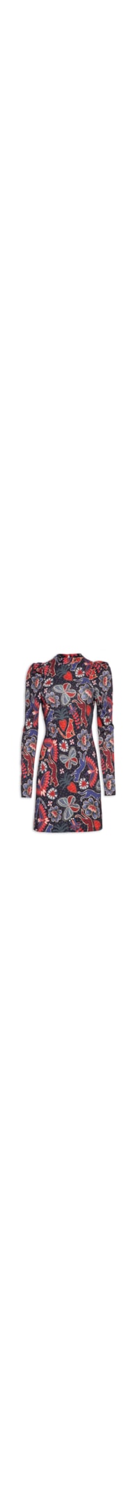 O vestido azul é confeccionado em malha com média elasticidade. A peça justa ao corpo possui gola alta, mangas longas com detalhe de franzido nos ombros, mix de estampas em cores contrastantes, recorte posterior vazado, comprimento curto e fechamento posterior por botão.