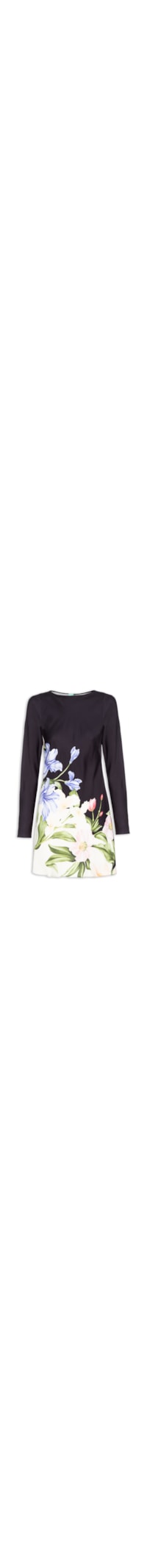 O vestido preto é confeccionado em tecido leve com baixa elasticidade. A peça solta ao corpo possui decote arredondado, mangas longas, mix de estampas em cores contrastantes e comprimento curto.