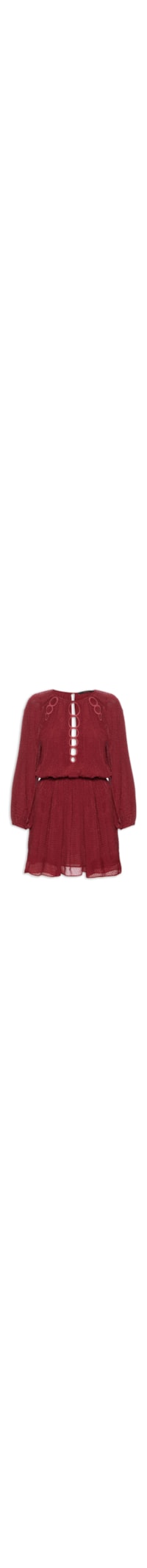 O vestido vinho é confeccionado em crepe sem elasticidade com superfície texturizada. A peça solta ao corpo possui decote redondo, decote vazado posterior, mangas longas modelo raglan, recortes em circulos vazados na parte frontal, recorte na altura da cintura com elástico embutido, comprimento curto, forro, acabamento pespontado e fechamento posterior por botão.