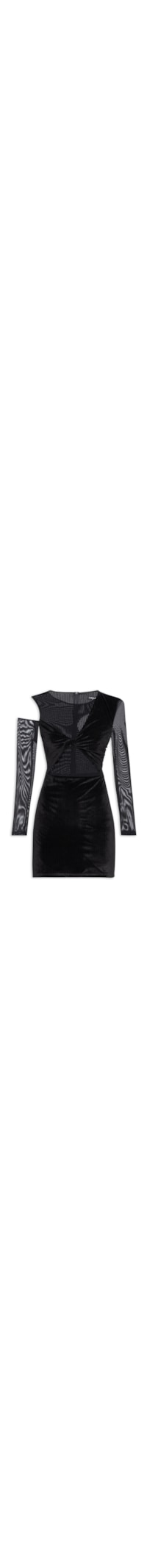 O vestido preto é confeccionado em veludo com superfície canelada de baixa elasticidade. A peça justa ao corpo, possui decote redondo, mangas longas em tule, recortes frontais em tule, recortes vazados nos ombros e na parte frontal, detalhe de torção frontal, tag metalizada da marca aplicada na parte posterior do decote, comprimento curto, forro e fechamento posterior por zíper invisível.