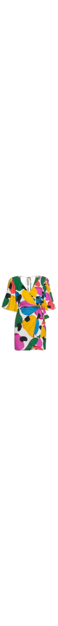 O vestido rosa é confeccionado em tecido leve. A peça solta ao corpo possui decote V transpassado, mangas 3/4 bufantes, recorte posterior com cordões alongados para amarração, recorte posterior, sobreposição frontal com faixas alongadas na altura da cintura, estampa figurativa de cajus em cores contrastantes, comprimento curto e fechamento lateral por amarração.