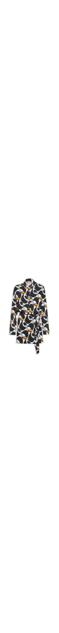O vestido preto é confeccionado em tecido leve sem elasticidade. A peça solta ao corpo possui colarinho clássico, mangas longas, recorte na altura da cintura com franzidos, estampa figurativa de tucanos em cores contrastantes, faixas alongadas na parte lateral para amarração, comprimento curto e fechamento na parte frontal por botões com vista sobreposta e na parte lateral por zíper invisível.